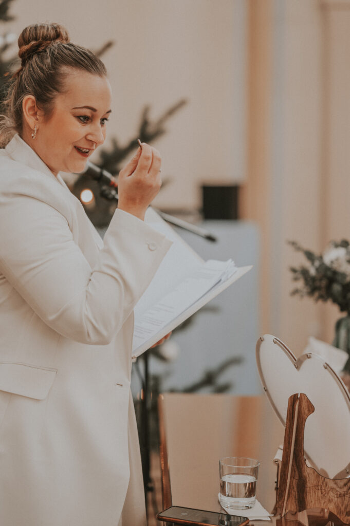 An eurem Hochzeitstag bin ich nicht einfach nur die Rednerin im Hintergrund. Ich bin frühzeitig vor Ort, etwa ein bis eineinhalb Stunden vor eurer freien Trauung, mit meiner eigenen Technik im Gepäck und einem klaren Blick für alles, was jetzt wichtig ist. Aufbau, Soundcheck und letzte Absprachen übernehme ich.